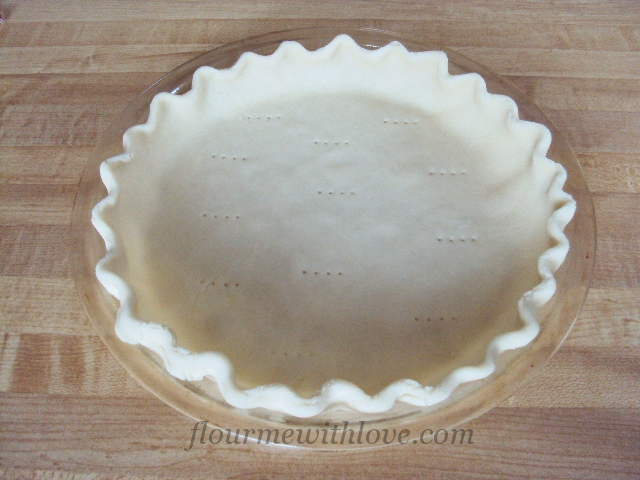 Place dough into the pie plate; pierce fork marks on the bottom; set aside.