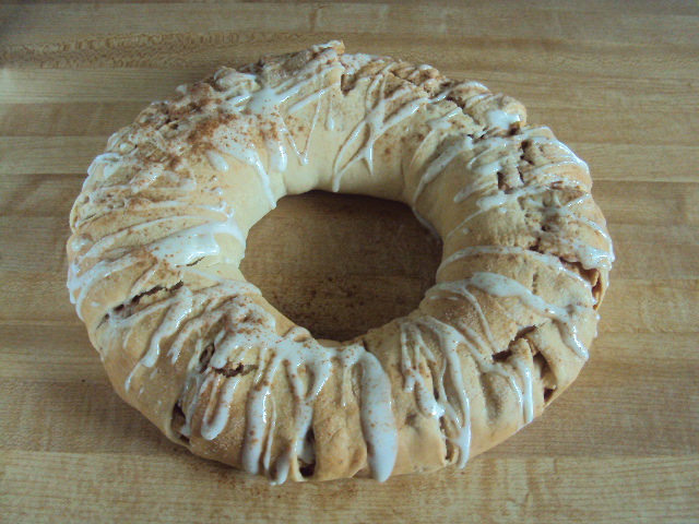 I wanted to make a tea ring the other day, but wanted something different. On a whim I decided to fill it with cinnamon, sugar, apples and cream cheese (yes, I love cream cheese!). This came out incredibly good; soft chewy dough with the slightest sweetness from the cinnamon sugared apples and sweetened cream cheese. I couldn’t stop there so I drizzled on some cream cheese icing and sprinkled a dash of cinnamon on top!Ingredients are as follows: