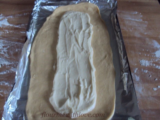 Place dough onto prepared cookie sheet then spread half of the cream cheese mixture down the center of the dough.