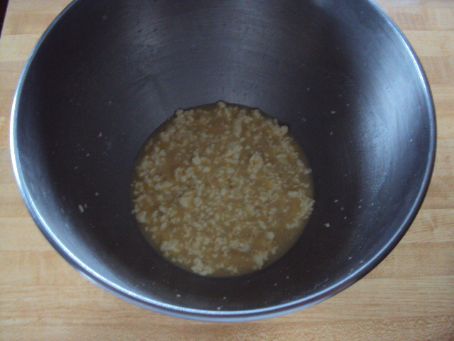 Add in the yeast mixture and butter. Mix together for two minutes. (The mixture may be clumpy, but that won’t be a problem.)