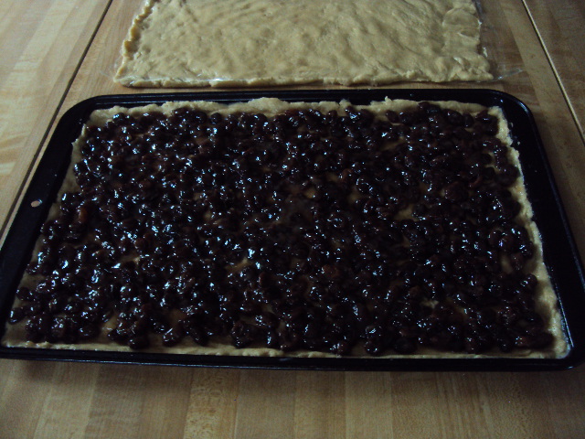 Flip first layer of dough on top of raisins; covering evenly.