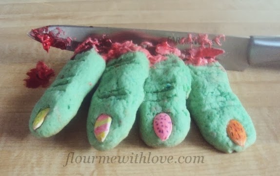 It’s as simple as making the cookie dough, adding the green food coloring, roll them and bake. When they’re done, place a finger nail on top, add red food coloring to the icing and add a dash to the ends. Then it’s time to serve some spooky fingers!
