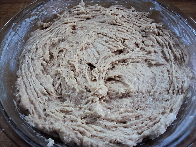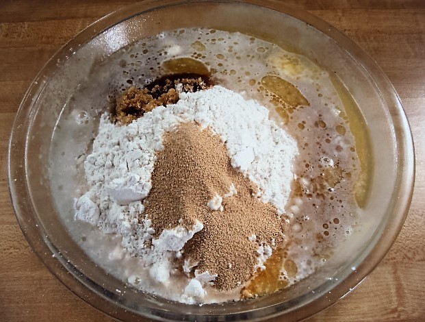 In the same dish, put in the flour, yeast, brown sugar, salt, water, butter, and vanilla.