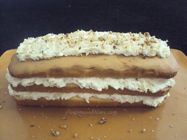 Brush some pineapple juice onto the cut side of the top layer and then place it on top. Add a little swirl of cream mixture on top and sprinkle on the toasted pecans…serve and enjoy!