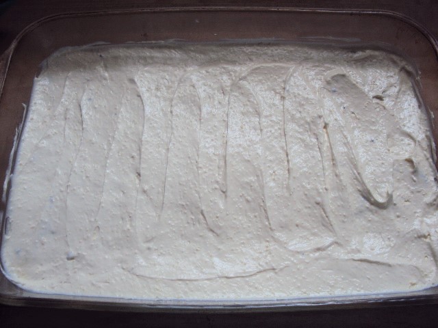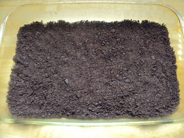 In a 9 x 13″ pan, sprinkle 1/3 of the cookie crumbs onto the bottom.