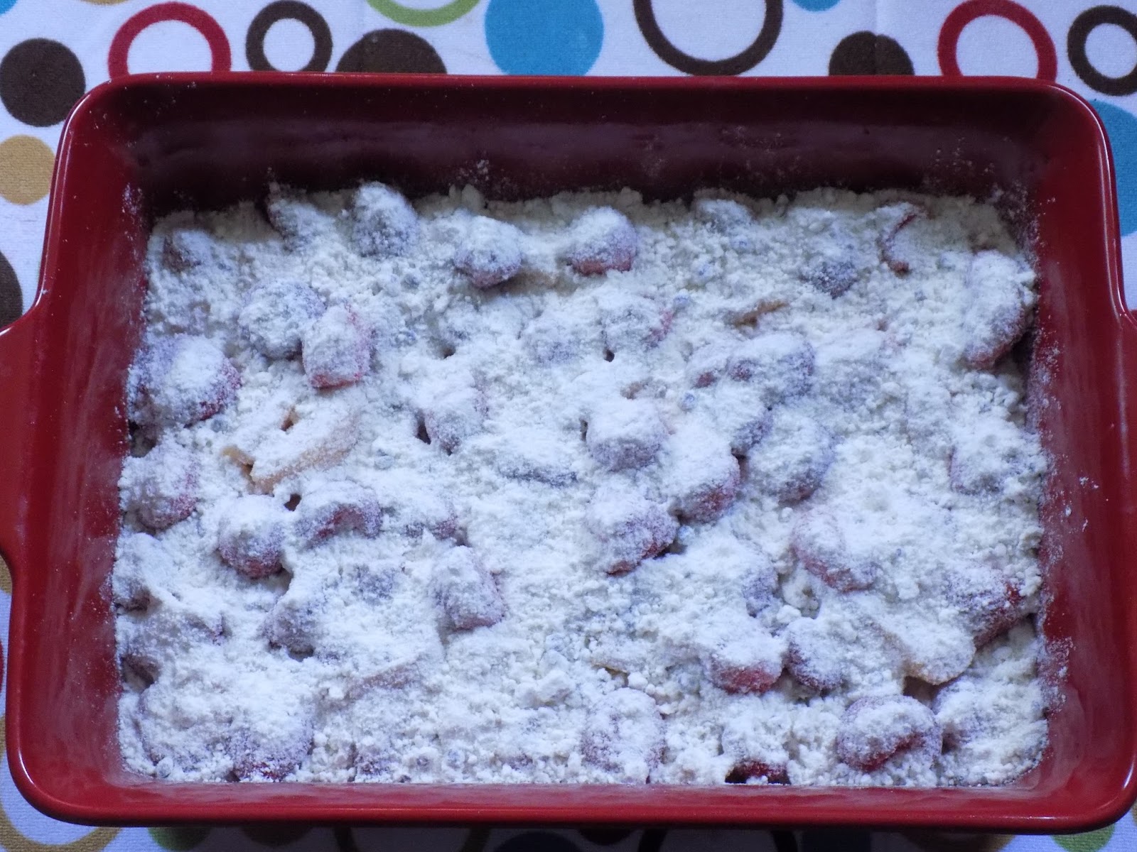 Bake for 1 hour and 15 minutes; until golden brown. My topping was still dry so about half way through the baking, I stirred it around a little to mix with the fruit juices.